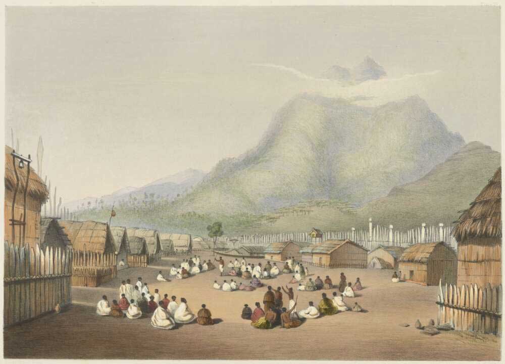 Taonga katoa is all that the people value, and this includes the wharepuni – the small family homes shown in the painting of a kainga, above. Wharepuni are more akin to the modern day mobile home than the English building. They exist to provide shelter for as long as it is needed, but their connection to the land is transitory.